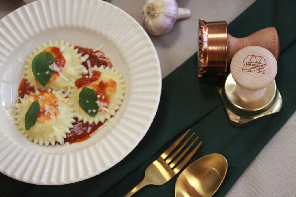 Равиоли родились на острове Сицилия, родине многих других вкусных рецептов итальянской кухни. Первое известное историческое упоминание о блюде относится к 14 веку в трудах Франческо ди Марко Датини, продавца из Венеции. В рукописи был рецепт равиоли со свежей зеленью, яйцом и сыром, приготовленных на говяжьем бульоне. В то время у равиоли не было начинки, это были просто кружочки или прямоугольники теста, помещаемые в супы и бульоны, хорошо приправленные травами и специями. Яйца, сыр, рикотта и травы были первыми начинками, представленными в равиоли, и до сих пор остаются самыми традиционными начинками. Сегодняшний рецепт - классические равиоли с рикоттой, сыром и зеленью в томатном соусе. Чтобы приготовить настоящие равиоли дома, вам понадобятся: тестораскатка и форма для равиоли. Я использую Marcato Atlas. Техника для кухни от итальянских производителей, без сомнения, является самой универсальной техникой с возможностью приготовления 3 видов пасты: спагетти, феттучини и тальолини. Дл