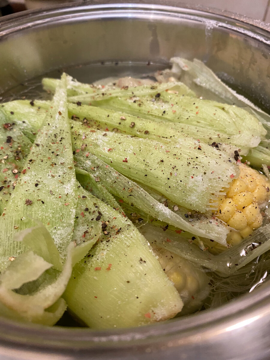 Перед тем, как поставить кастрюлю на плиту, выкладываем вниз кастрюли всю шелуху от початка кукурузы, выкладываем початки и сверху закрываем оставшимися листами.