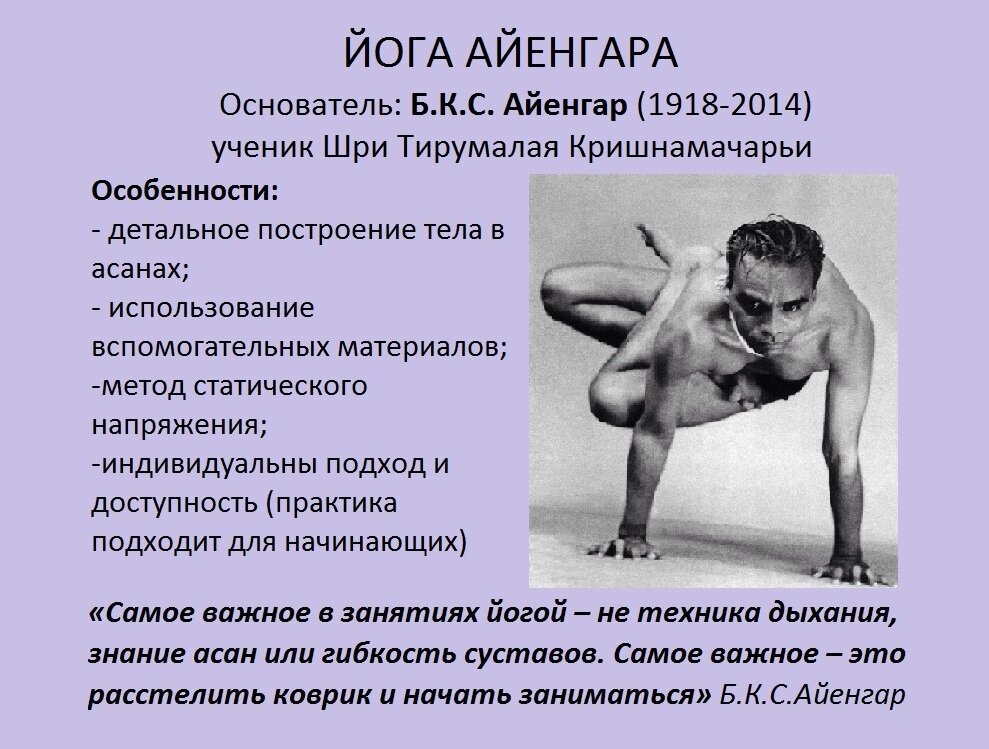Йога Айенгара – самый распространенный стиль хатха-йоги. Именно в традициях этой школы чаще всего преподают йогу в фитнес клубах. Обусловлено это тем, что данным видом йоги могут заниматься люди с любым уровнем подготовки. В методе Айенгара большое внимание уделяется технике выполнения асан. Одной из главных отличительных особенностей йоги Айенгара является использование специальных приспособлений для выравнивания тела в асанах: блоки, ремни, подушки и пр. Асаны выполняются в статике, что способствует развитию гибкости, оказывает влияние на внутренние системы человека и на его эмоциональное состояние. Йога Айенгара подходит начинающим, потому что упражнения в этом стиле можно адаптировать под любые возможности. Благодаря индивидуально подбираемым асанам, йога Айенгара помогает решать различные проблемы со здоровьем. Аштанга-Виньяса йога – это динамическая практика хатха-йоги, в которой переходы из одной асаны в другую осуществляются через виньясы. В этой практике важно соблюдать опре