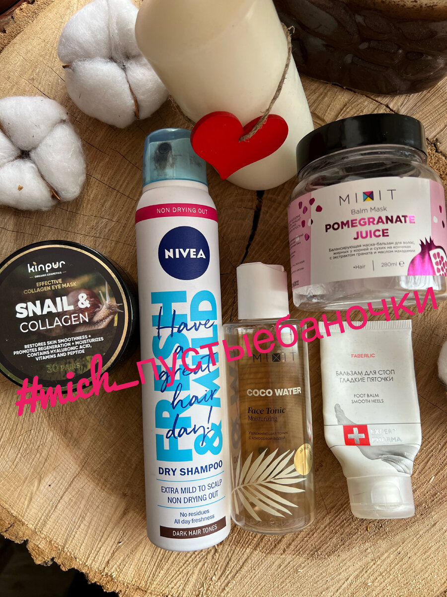 Хочу начать эту неделю ноября с Вашей любимой рубрики #mich_пустыебаночки ⠀ 1️⃣Уже полюбившиеся мне патчи корейской фирмы Kunpur. Эти патчи содержат муцин улитки и помимо своей основной цели - темные круги и отеки, они еще хорошо убирают мелкие морщинки. Цена на wildberries сейчас 350₽ #чернаяпятницарулит 😃 Я их покупала за 1500₽ ☺️ ⠀ 2️⃣Сухой шампунь для темных волос от Nivea. Незаменимая вещь👍 Без белых следов. Цена 350₽, мне хвате надолго. ⠀ 3️⃣Увлажняющий тоник для лица с кокосовой водой от Mixit. Подходит для всех типов кожи. Бережно способствует восстановлению кислотно-щелочного баланса кожи после умывания. В составе гиалуроновая кислота, которая увлажняет кожу. Цена на сайте около 500₽ за 150 мл. ⠀ 4️⃣Балансирующая маска-бальзам для волос, жирных у корней и сухих на кончиках с экстрактом граната и маслом макадамии от Mixit. Эта маска напоминает мне о лете🫶 Пользовалась ей в путешествиях, от этого, наверное, безумно ее полюбила 😀 Цена на сайте 650₽, за объем 280 мл ⠀ 5️⃣