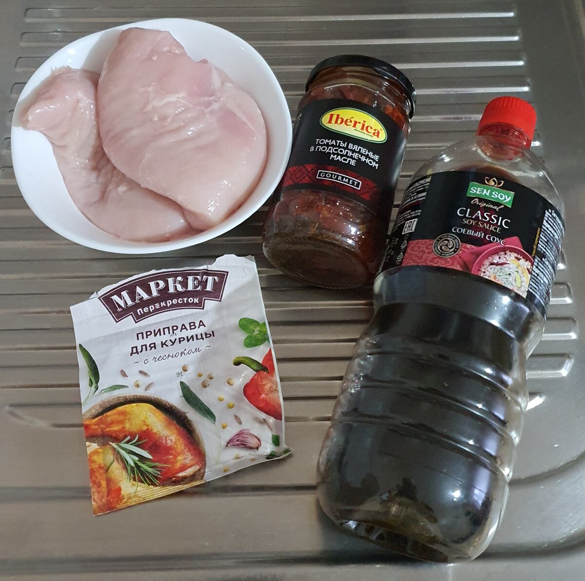 Вся прелесть этого блюда заключается в том, что готовится оно накануне праздника и практически без вашего участия. Из минимального количества продуктов. На столе смотрится очень эффектно. Гости останутся в восторге! Ингредиенты: - куриная грудка 2 филе - соевый соус 1 столовая ложка - ваша любимая приправа для курицы 1 чайная ложка - вяленные томаты приблизительно 5 кусочков Куриное филе укладываем в миску и маринуем в соевом соусе с приправой около часа при комнатной температуре. На одно филе укладываем вяленные томаты. Накрываем вторым филе, так чтобы тонкая его часть, лежала на толстом крае нижнего филе. Крепко перевязываем получившийся "бутерброд" кулинарной нитью. Если таковой дома не нашлось, можно перевязать кулинарным рукавом, предварительно порезав его на ленточки. Хвостики максимально обрезаем, чтобы нить не горела. Запекаем в рукаве или стеклянной форме с крышкой, около часа, при температуре 180 градусов. Далее выключаем духовку и не открывая, оставляем рулет осты