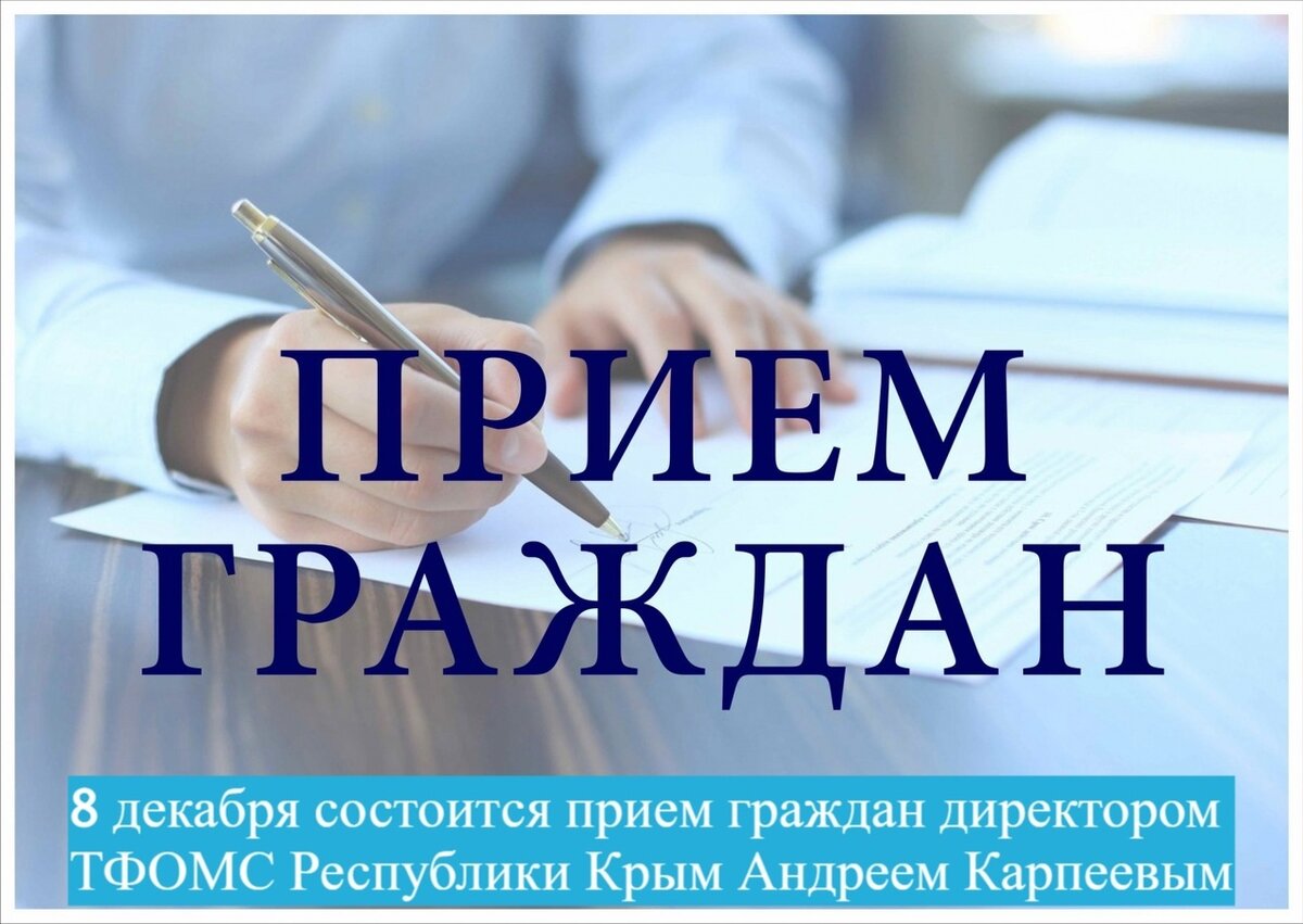 Территориальный фонд обязательного медицинского страхования Республики Крым информирует о приеме граждан. Прием устных обращений граждан проведет директор ТФОМС Республики Крым Андрей Юрьевич Карпеев 8 декабря в Региональной общественной приемной Д. А. Медведева в Республике Крым (г. Симферополь, ул. А. Невского, д. 8) 🕚 с 11:00 до 12:00. 🔹 Крымчане могут обратиться к руководителю ТФОМС Республики Крым с вопросами о порядке получения полисов обязательного медицинского страхования, прикрепления к поликлинике, при наличии проблем при оказании бесплатной медицинской помощи в медицинских организациях региона, в случаях взимания денежных средств при обращении по полису ОМС и т. п. ☎ Необходима предварительная запись на прием по телефонам (3652) 77-23-77, 77-25-77. #Крым #ТФОМС_Крыма #ОМС #будьте_здоровы