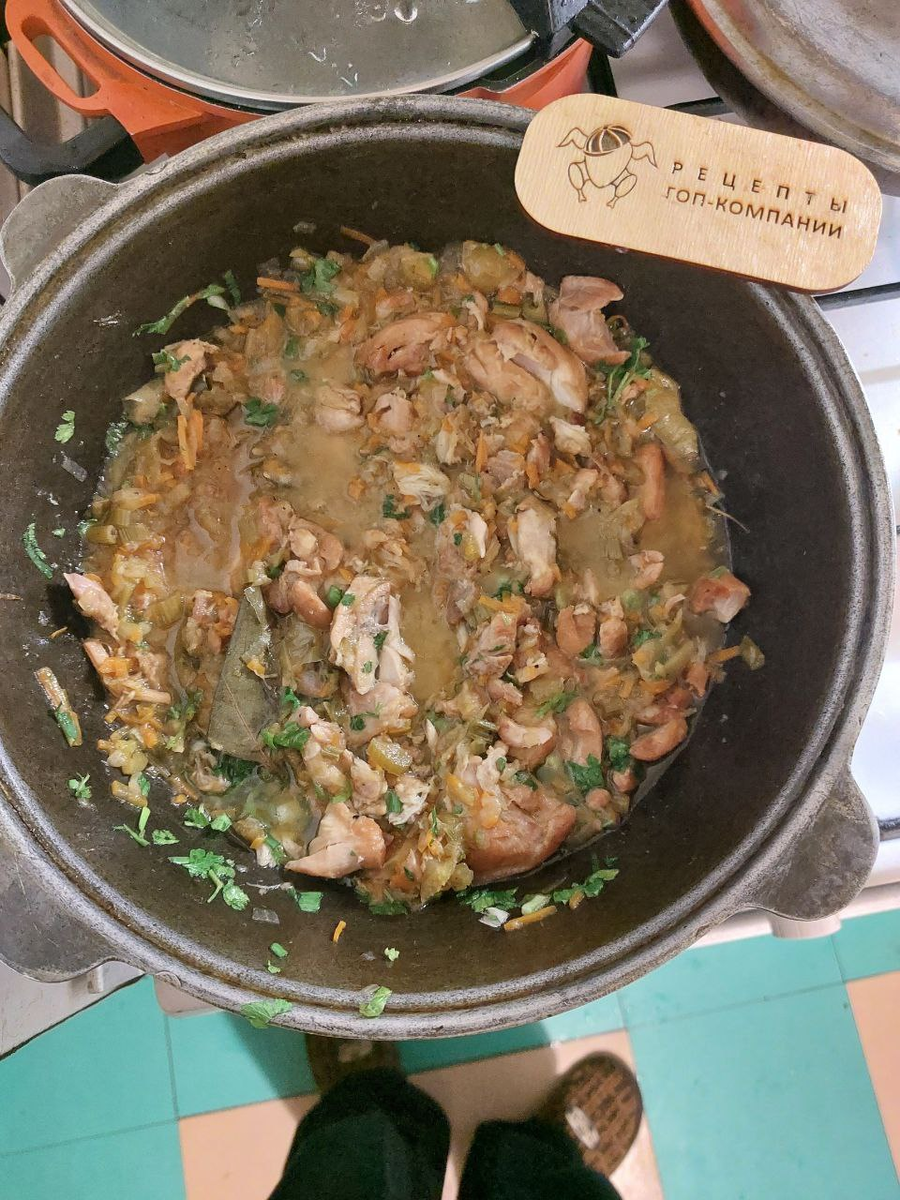 Когда очень хочется мягкого тушеного мяса, но не такого, как покупная тушенка, и не такого, как холодец, а чего-то этакого, мы готовим тушенину. Лучше всего она получается из птицы, но при желании можно сварганить её из свинины или говядины. Мы взяли куриные бедра, сразу две упаковки - семья-то большая. Бедра моем, режем пополам. Порционно обжариваем, приправив ароматной солью. У нас была Адыгейская Бжедугская. Доводим до уверенной корочки, снимаем с огня. Тем временем режем зелень. У нас была петрушка, зеленый лук и розмарин. Розмарин оставили на веточках, чтобы потом было удобно его извлекать из готового блюда. Готовим овощную основу. Порезали довольно крупно лук. Из заморозки извлекли запасы болгарского зеленого перца, моркови и любистока, он же зимний сельдерей. Любисток кладем совсем немного, потому что он очень ароматный. Поливаем оставшимся после жарки мяса маслом, ставим на огонь. Вот так наша овощная основа выглядит через двенадцать минут, когда она успела потушиться и уменьш