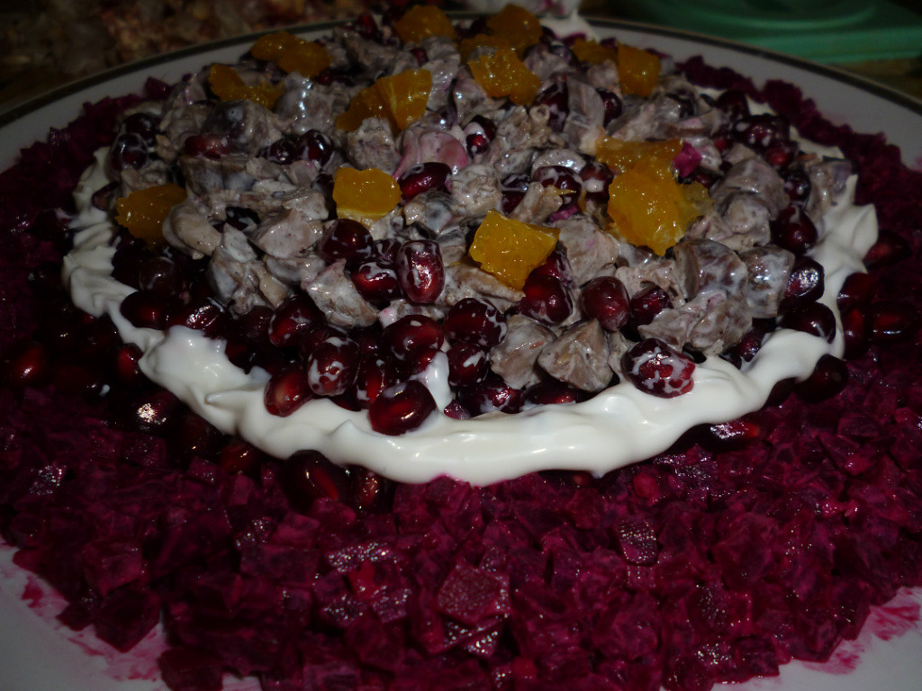 Ингредиенты: куриные сердечки-0,5 кг; свекла-2 шт; гранат-1шт; чеснок- по вкусу; сметана-3 ложки 10%; майонез-1 ложка; ломтик апельсина.
