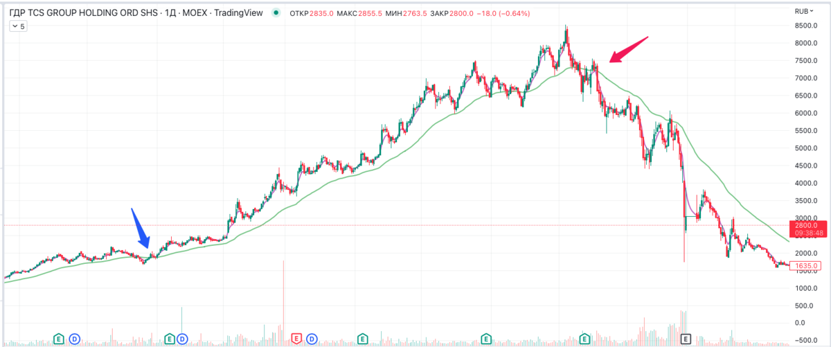 Например, ЕМА 12 (короткая) пересекает EMA 50 (длинная). Синяя стрелка (ниже на рисунке) на пересечении 12 и 50 (12 выше 50) – тренд бычий Красная стрелка (ниже на рисунке) на пересечении 50 и 12 (50 выше 12) – тренд медвежий. Можно использовать разные комбинации СС (ЕМА 12/50, 8/21, 26/50 или МА 5/10, 10/30, 50/200) на разных ТФ. EMA будет быстрее реагировать на изменение цены, следовательно у вас может быть много точек входа, но будет много ложных сигналов. МА будет медленнее реагировать на изменение цены, сигналов на вход будет меньше, но и количество ложных тоже станет меньше. Что лучше ЕМА или МА? Это зависит от того, насколько рано или поздно вы хотите поймать тренд, и сколько ложных сигналов хотите получать. 1. Использование коротких настроек (5, 10, 12, 20) приведет к обнаружения тренда рано, с высоким п