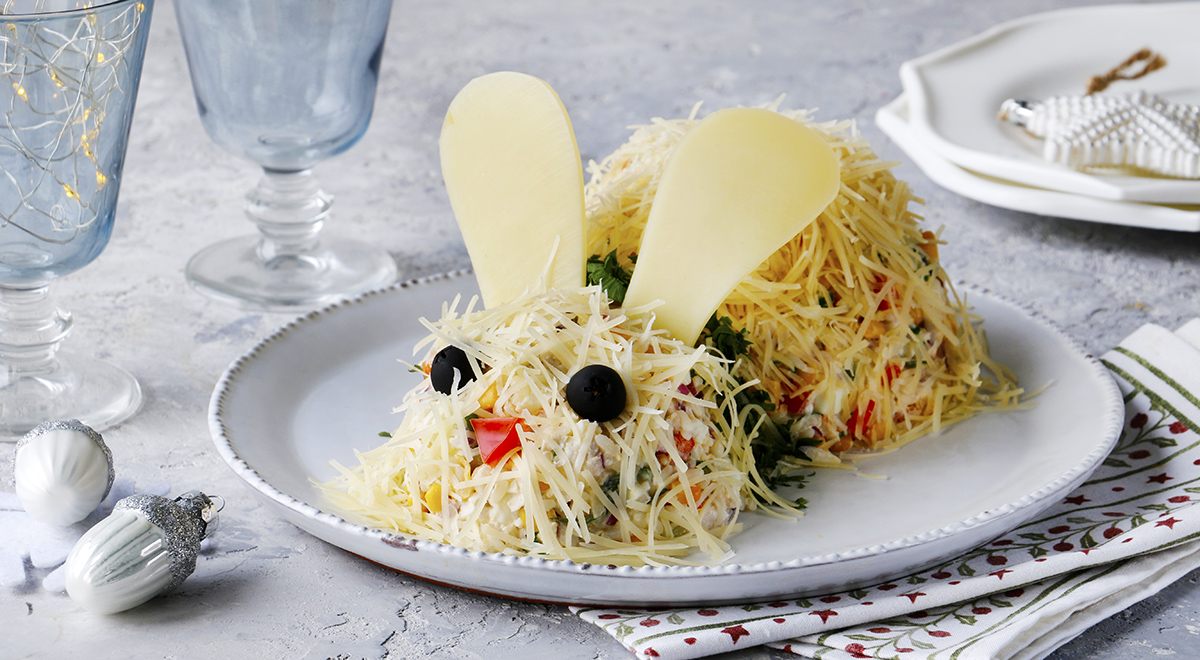 ИНГРЕДИЕНТЫ ПОШАГОВЫЙ РЕЦЕПТ ПРИГОТОВЛЕНИЯ Шаг 1 Приготовьте все ингредиенты для новогоднего салата. Куриное филе отварите в подсоленной воде (40 минут после закипания). Рис отварите до полной готовности по инструкции на упаковке. Яйца сварите вкрутую (10 минут после закипания). Всем ингредиентам дайте полностью остыть. Шаг 2 Консервированную кукурузу для салата откиньте на сито и дайте стечь жидкости. Свежие огурцы вымойте и очистите. Очень мелко нарежьте. Так же нарежьте сладкий перец (один маленький кусочек отложите для украшения салата). Шаг 3 Отрежьте от куска сыра 2 тонких ломтика в виде длинных «ушек» и отложите дляя украшения «кролика». Оставшийся натрите на мелкой терке. Красный лук очистите и мелко порубите. Петрушку вымойте, хорошо обсушите бумажным полотенцем и оборвите с веточек листочки. Листочки очень мелко нарежьте. Шаг 4 Куриное филе нарежьте маленькими кубиками. Яйца очистите и разомните толкушкой для картофельного пюре. Пересыпьте в большую миску. Добавьте куриное фи