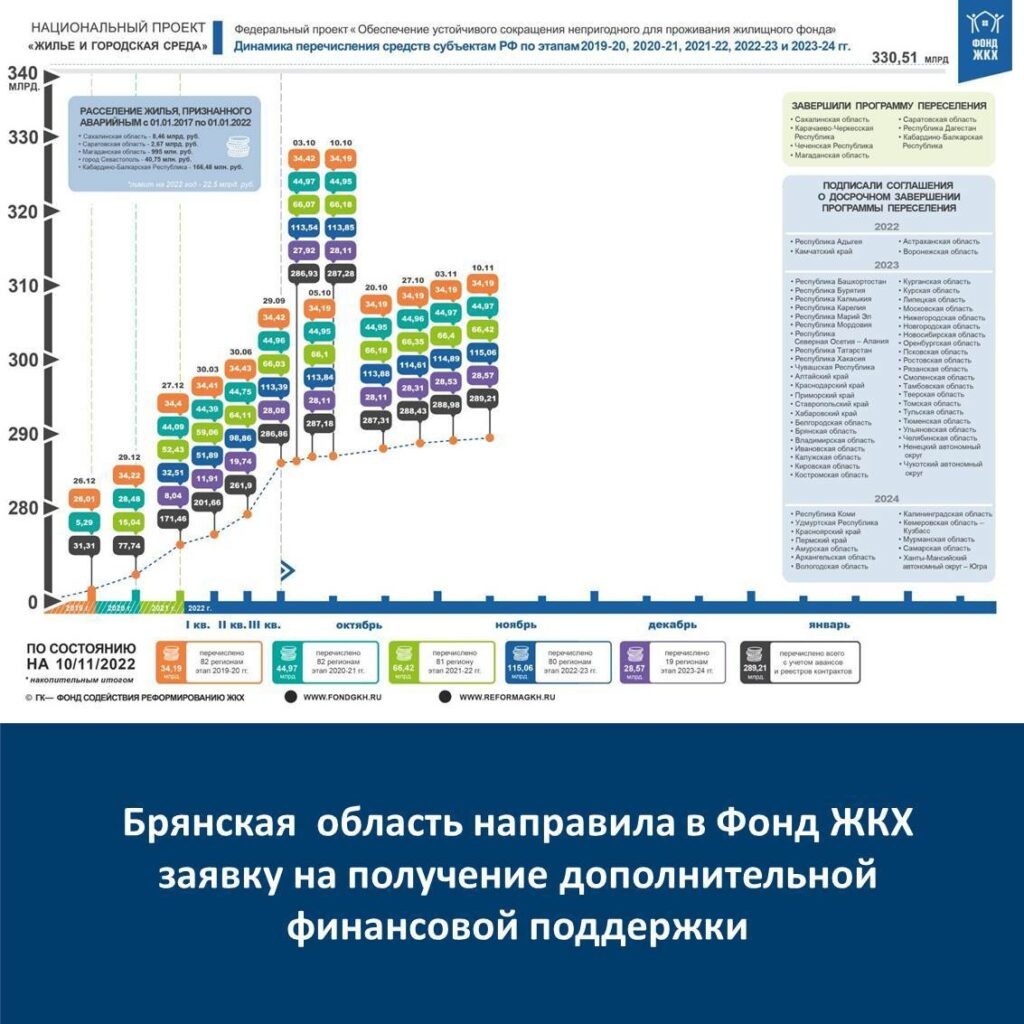 В соответствии с заявкой Брянская область для реализации этапа 2022-2023 годов программы переселения планирует дополнительно получить 93,66 млн. рублей из средств Фонда жилищно-коммунального хозяйства , в порядке софинансирования регион добавит 0,95 млн. рублей.