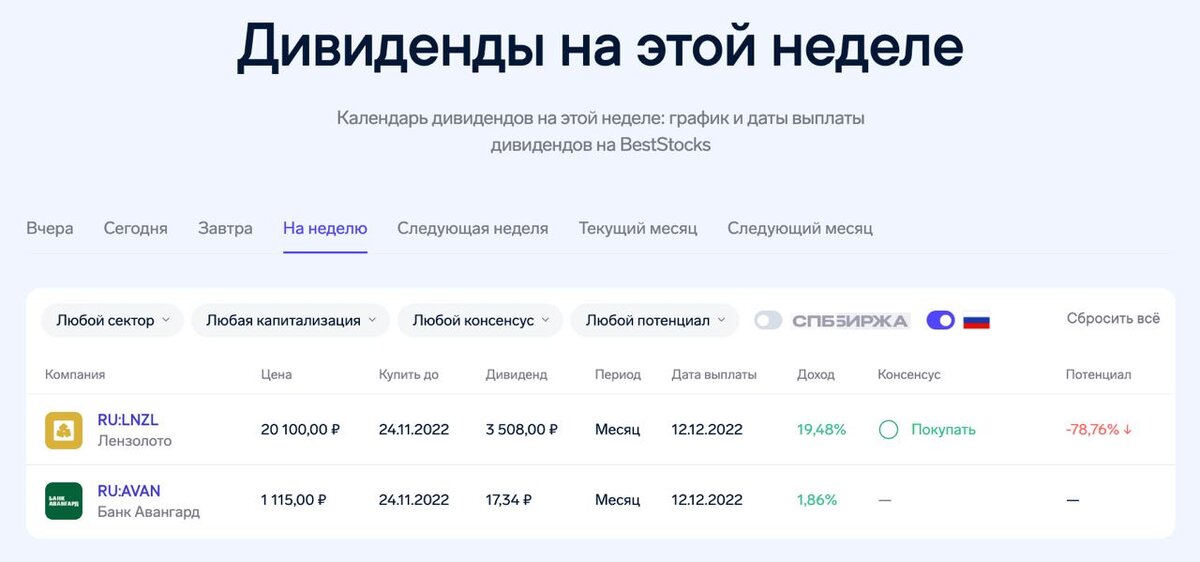 Лензолото (Лензолото) • Доходность: 19,48% • Цена акции: 20 100,00 ₽ • Купить до: 24.11.2022 Банк Авангард (AVAN) • Доходность: 1,86% • Цена акции: 1 115,00 ₽ • Купить до: 24.11.2022 Список всех компаний, которые платят дивиденды, доступен бесплатно в календаре дивидендов → @beststocksru