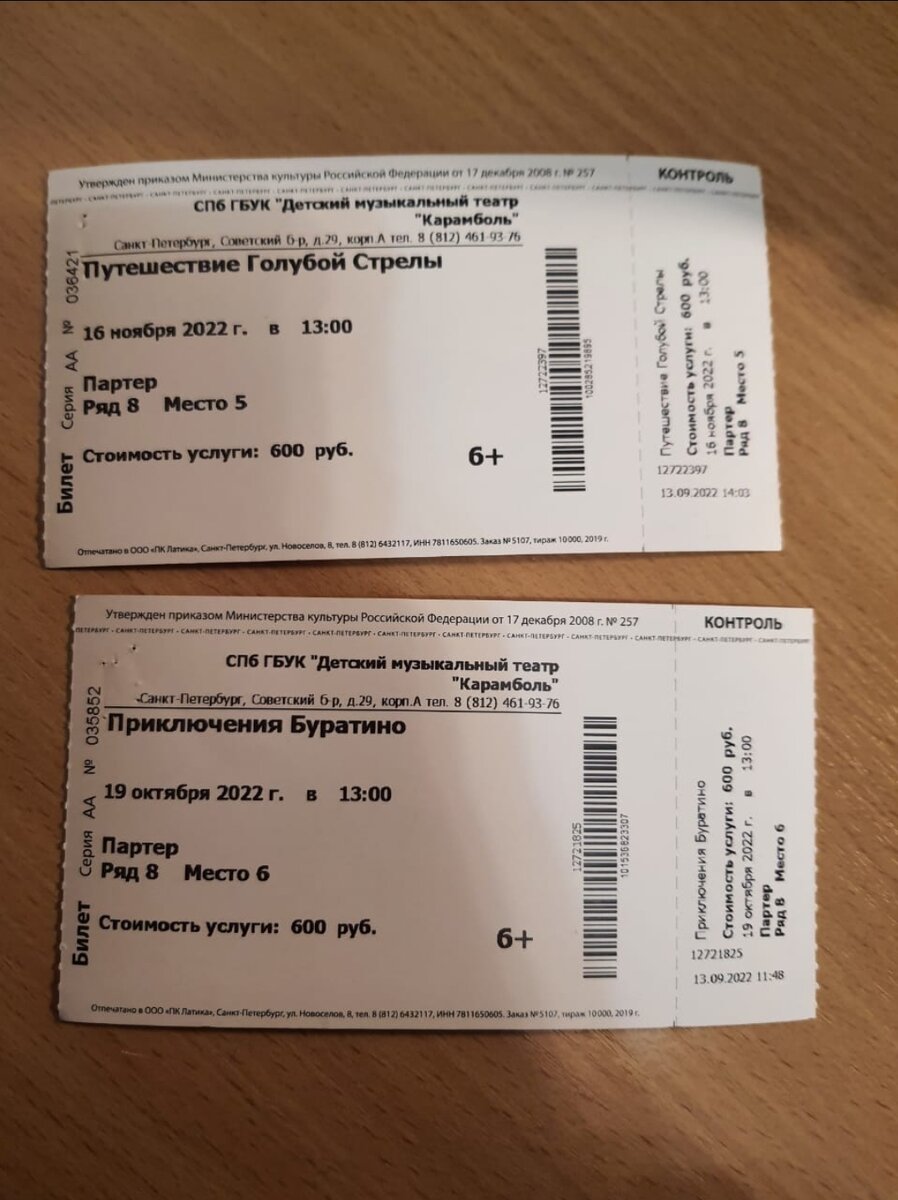 Мы с Симой хотели попасть на "Путешествие Голубой Стрелы" театра Карамболь. Спектакль относится к школьным абонементам. Мы попросили друзей предупредить распространителя билетов на случай, если будут билеты. Всякое ж бывает. Осень. Дети болеют.