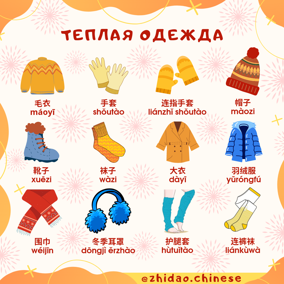#zhidao_шпаргалки 📝 Наступают холода, поэтому сегодня мы подготовили для вас шпаргалку на тему "Теплая одежда" (暖衣服 nuǎnyīfu)! 🧥 🔸毛衣 máoyī свитер 🔸手套 shǒutào перчатки 🔸连指手套 liánzhǐ shǒutào рукавицы, варежки, митенки 🔸帽子 màozi шапка 🔸靴子 xuēzi сапоги, ботинки 🔸袜子 wàzi носки 🔸大衣 dàyī пальто 🔸羽绒服 yǔróngfú пуховик 🔸围巾 wéijīn шарф 🔸冬季耳罩 dōngjì ěrzhào зимние наушники 🔸护腿套 hùtuǐtào гетры 🔸连裤袜 liánkùwà колготки 📝 Ссылка на карточки Quizlet для изучения новых слов: https://quizlet.com/_cdsb7o?x=1jqt&i=2r5snr ❗В Quizlet вы можете послушать произношение всех слов! Для этого в различных режимах изучения или при просмотре списка слов нажмите на значок микрофона 🔊 📚 Хотите, чтобы Вы или Ваш ребенок заговорили на китайском? Напишите нам для записи на групповые / индивидуальные занятия! 🎓 #china #chinese #школакитайского #китайский #москва #язык #китайскиймосква #учукитайский