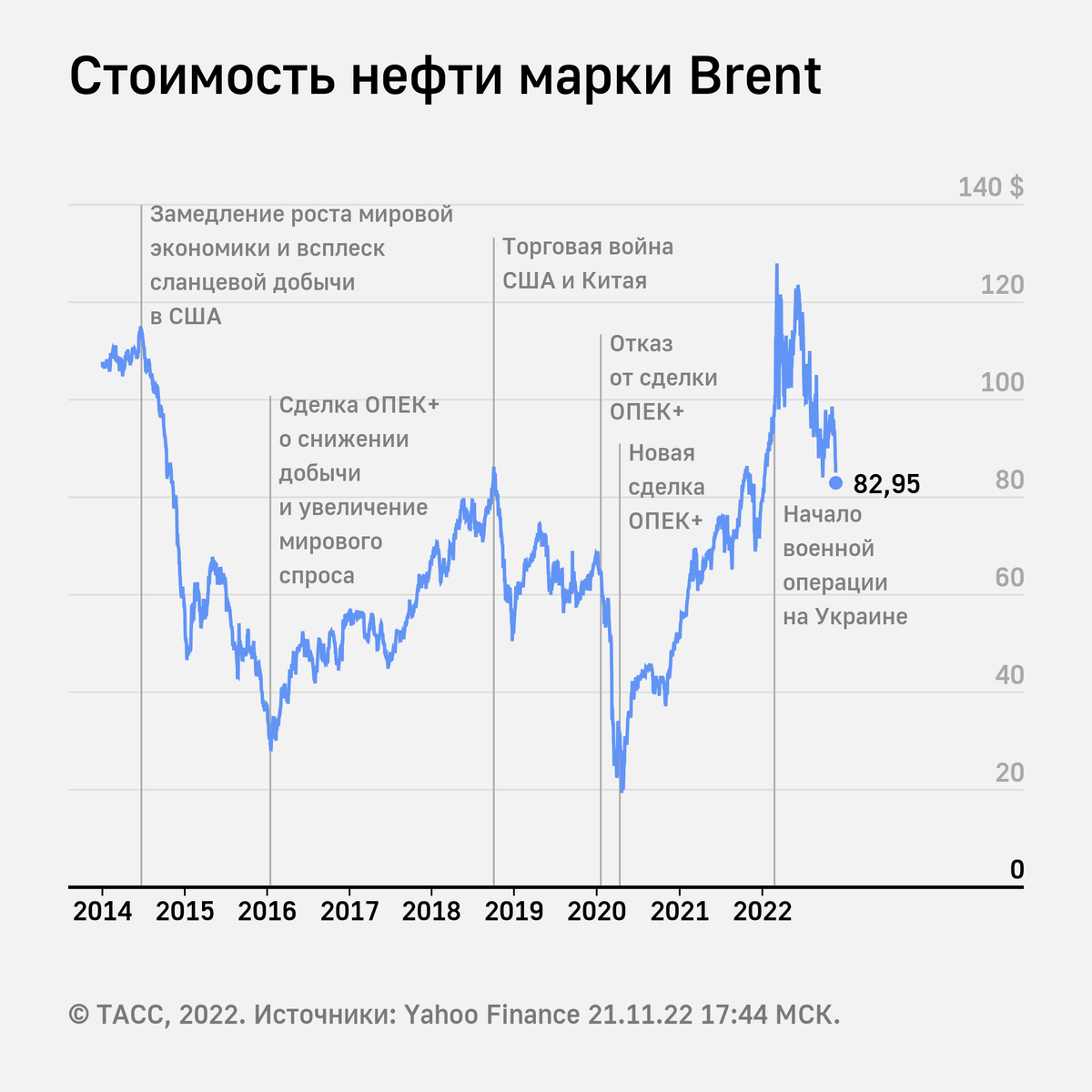 Фьючерс на нефть марки WTI с поставкой в январе 2023 года снижался на 4,77% МОСКВА, 21 ноября. /ТАСС/. Стоимость фьючерса на нефть марки Brent с поставкой в январе 2023 года на лондонской бирже ICE кратковременно опускалась ниже $83 за баррель впервые с 28 сентября, свидетельствуют данные торгов. Так, по данным биржи на 17:44 мск, стоимость Brent снижалась на 5,33%, до $82,95 за баррель. К 18:00 мск цена на нефть марки Brent замедлила падение и находилась на уровне $83,4 за баррель (-4,82%). В то же время фьючерс на нефть марки WTI с поставкой в январе 2023 года снижался на 4,77% - до $76,29 за баррель.
