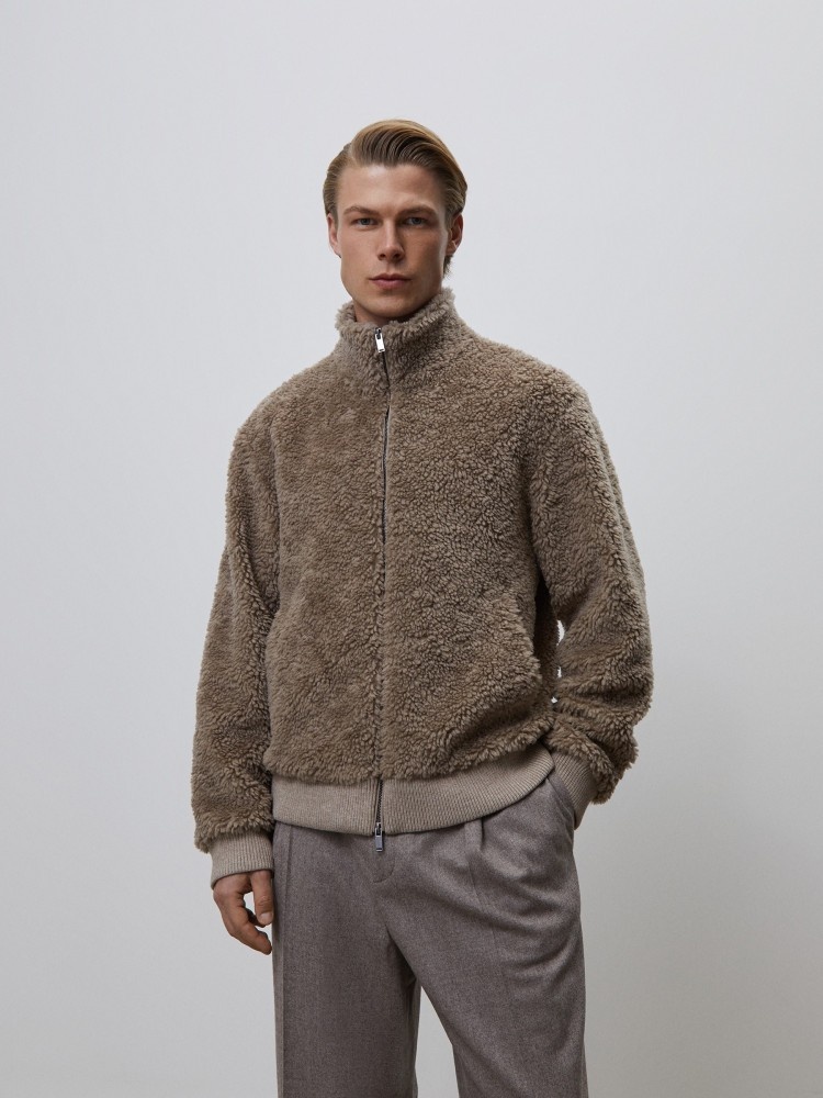 С 2021 года 12 STOREEZ начали идти в сторону устойчивого развития. Бренд поставил цель к 2030 году перейти на 60% на материалы более «легкие» с точки зрения воздействия на планету: перерабатываемые, переработанные, созданные с соблюдением международных экологических стандартов. В каждой капсуле есть модели, соответствующие цели. Новинка мужской коллекции: бомбер из стриженой шерсти. Объемный, но легкий по весу бомбер с густым и теплым ворсом. Визуально он напоминает популярные teddy bear coat. Наша модель выполнена из мягкой шерсти, стриженной этичным способом без вреда для жизни и здоровья овец. Шерсть аккуратно срезается и наклеивается на тканую основу. Получается материал с густым, как у шубы, ворсом, курчавым и средним по длине. Легкий бомбер с густым и теплым ворсом можно носить как куртку или кардиган — с джинсами, кроссовками и брюками из трикотажа. Эта модель идеальный выбор для тех, кто выбирает уютные дни в большом доме с камином или энергичные будни с перемещением между д