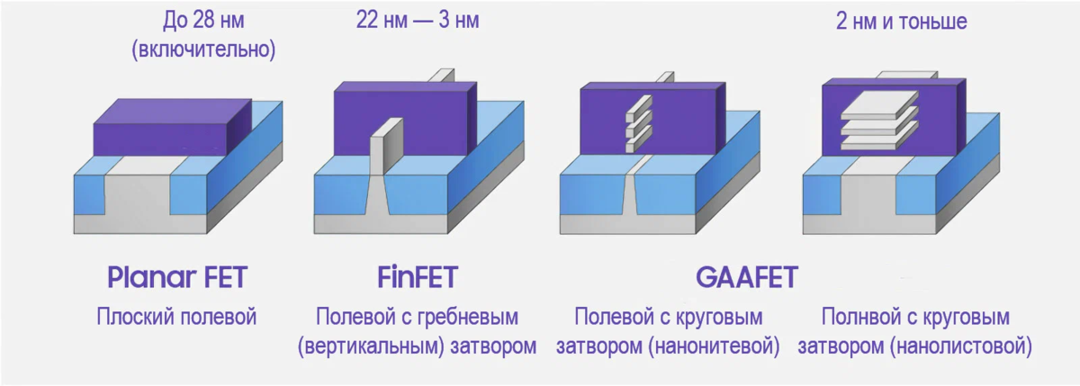 Несколько месяцев назад я написал статью об эволюции конструкций транзисторов в микропроцессорах. Приблизительно она выглядит так: