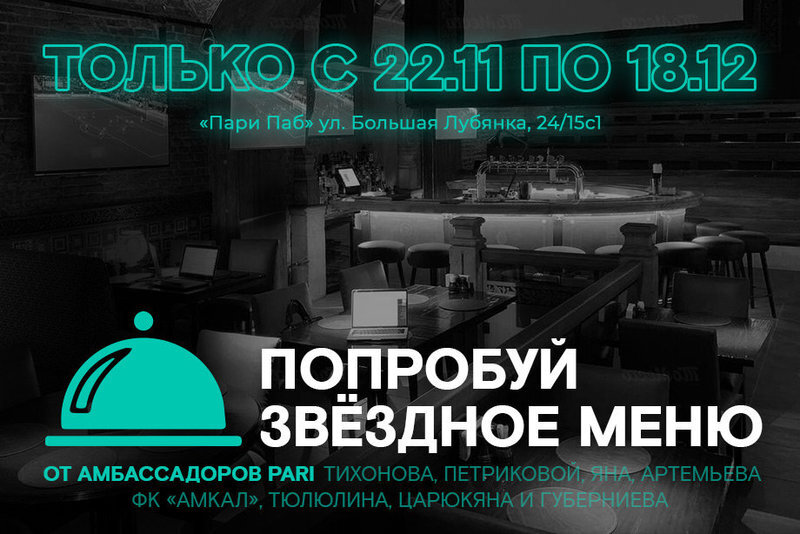 Букмекерская компания PARI и легендарный спортбар Пари Паб представляют специальное «звездное» меню на время Чемпионата мира по футболу 2022. В создании меню участвовали амбассадоры PARI, в том числе известный комментатор Дмитрий Губерниев и экс-футболист московского «Спартака» и сборной России Андрей Тихонов.
