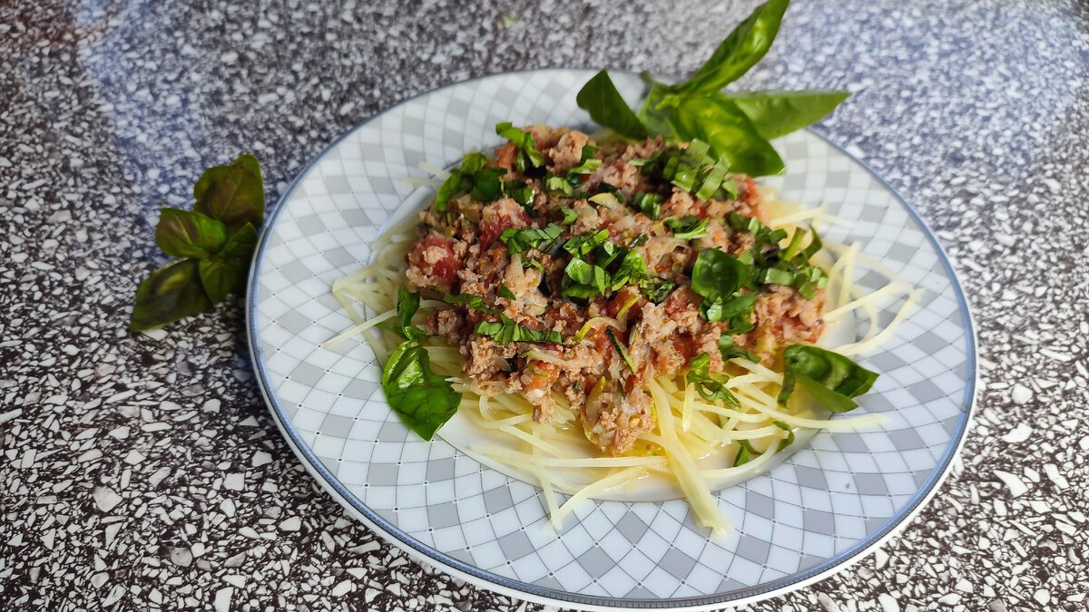 Сегодня я готовлю спагетти из картофеля под соусом Болоньезе, но можно приготовить с куриным филе или филе индейки.