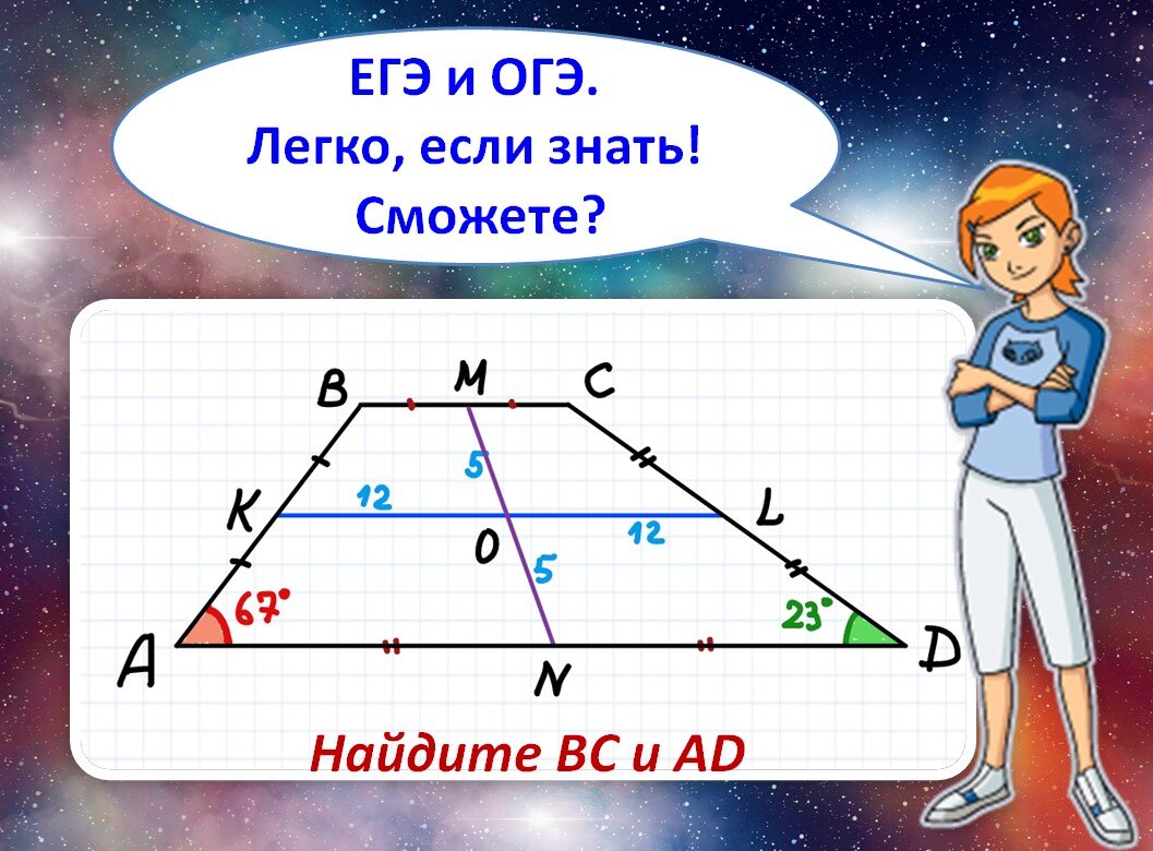 Итак, условие задачи. Дана трапеция ABCD. Отрезки, соединяющие середины сторон равны соответственно: KL=24, MN=10. Найдите основания трапеции.