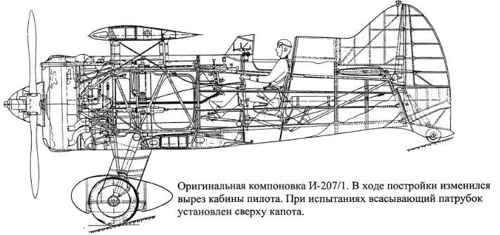 Модификация И-207 Размах крыла, м 6.98 Длина, м 6.34 Высота, м 3.46 Площадь крыла, м2 18.00 Масса, кг пустого самолета 1521 нормальная взлетная 1879 Тип двигателя 1 ПД М-63 Мощность, л.с. 1 х 1000 Максимальная скорость , км/ч у земли 427 на высоте 486 Крейсерская скорость , км/ч 405 Практическая дальность, км 640 Скороподъемность, м/мин 1087 Практический потолок, м 10200 Экипаж 1 Вооружение: четыре 7.62-мм пулемета ШКАС «Изделие 10» (Самолет №10) с двигателем М-71. Основой проекта стало желание создать высокоманевренный истребитель-биплан и одновременно доказать возможность получения на нем малых значений лобового сопротивления. Будучи подлинными рыцарями бипланной схемы, конструкторы отчаянно защищали свои идеи, основанные на предположении, что биплан имеет не меньшие возможности получения высоких полетных скоростей по сравнению с монопланом. Более того - они утверждали, что биплан имеет даже ряд бесспорных преимуществ. Он является более