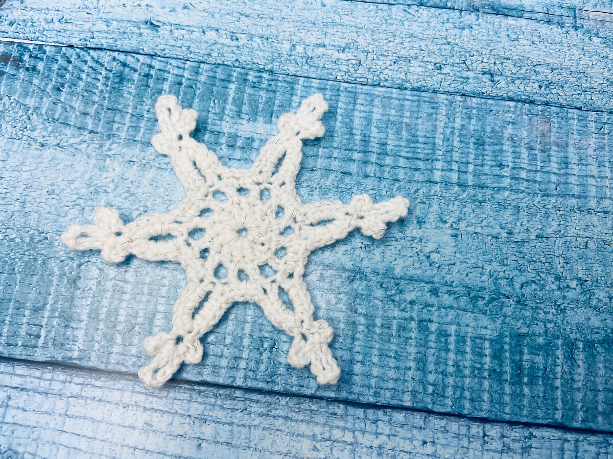 Нашла простенькую схему шестиугольной формы с выступами, которую немного переделала под снежинку, оформив особым образом каждый лучик снежинки. Тройные петельки на выступах шестиугольной детали в снежинку. Материалы и инструменты: Если надумаете связать такую же снежинку, то вам понадобится подготовить следующее: Схема снежинки. За основу я взяла эту схему. В последнем ряду в арки из вп я провязала не по 3 сбн, а по 4 сбн. Вместо 3 вп вверху каждой петли я провязала тройные арочки из 3 вп. Сокращения условных обозначения в вязании крючком, которые используются в данном мастер-классе: Вп – воздушная петля.