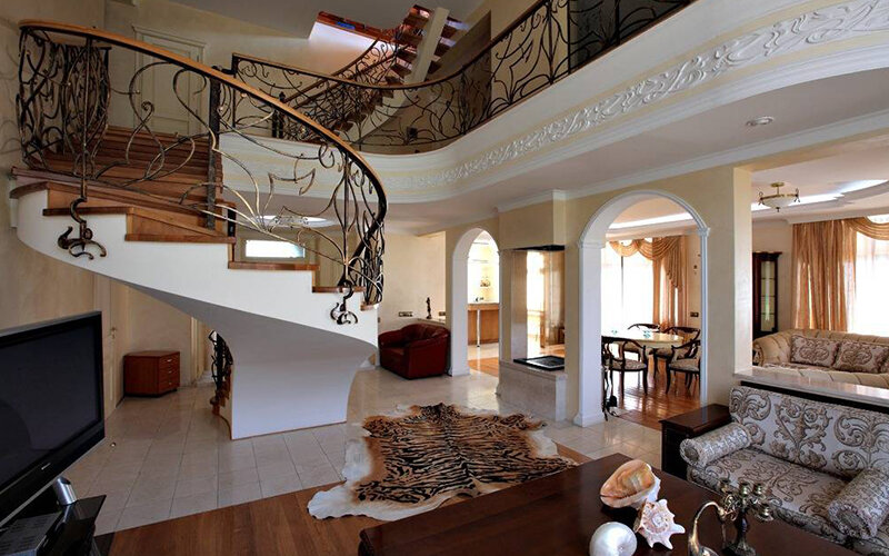 - витиеватые лестницы, лепнина или мозаика, витражи, двери и окна арочного типа, соответствующие элементы декора;