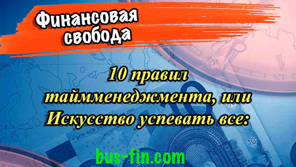 1.Планируйте свое время. Основная потеря времени происходит изза отсутствия планов. 2. Ведите хронометраж всех совершенных в течение дня дел. 3. В конце дня подводите итог всего, что вы успели сделать сегодня. 4. Используйте программы Skype, ICQ и т. п. только по делу. 5. Не совершайте незапланированных дел. 6. Отдайте свой телевизор в дом престарелых. 7. Меньше времени тратьте на тусовки и развлечения. 8. Вставайте на рассвете и старайтесь сделать все дела еще до обеда. 9. Отсекайте попытки людей украсть ваше время. 10. Живите так, словно это последний ваш день! Заходите на мой сайт «Финансовая свобода», там вы найдете много полезной информации про инвестиции, криптовалюту, бизнес, финансы и саморазвитие.