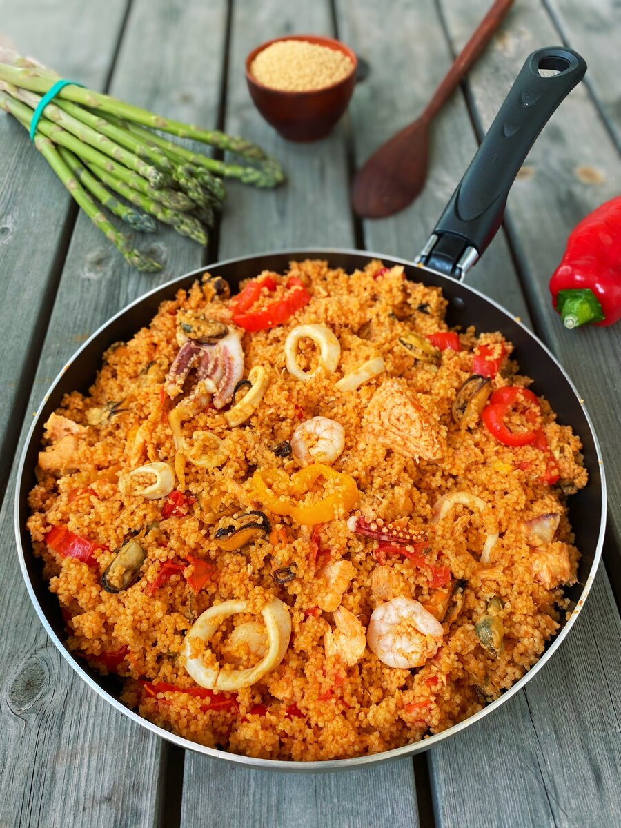 Паэлья — национальное испанское блюдо родом из Валенсии. Оригинальная версия паэльи готовится из риса и морепродуктов, но из-за огромной популярности этого блюда рецептов его сейчас существуют великое множество! ⠀Само слово паэлья (paella) означает "сковорода". В самых консервативных валенсийских ресторанах паэлью готовят и подают прямо в ней. ⠀Кстати, настоящую паэлью всегда готовят на костре прямо на улице. Этот традиционный способ приготовления отражает "объединяющую миссию" паэльи: её всегда готовят не на одного человека, а для большой компании. Идеальное блюдо, чтобы угостить большое количество друзей и родных! ⠀ ⠀И сегодня мы приготовим самую простую домашнюю паэлью из кус-куса! ⠀ ⠀Нам понадобится: 🔸 Кус-кус - 1 ст. (кус-кус впитывает намного больше воды, чем рис, поэтому следим за тем, чтобы блюда оставалось сочным в процессе приготовления)