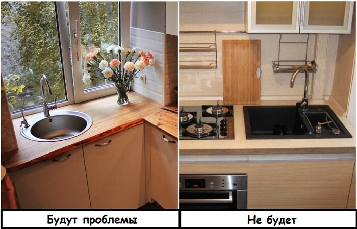Выбирая расположение мойки под окном, хозяйки надеяться на хорошее естественное освещение и отличный вид из окна. Увы, минусов у такого решения гораздо больше, чем плюсов. Во-первых, придется регулярно мыть стекло снаружи здания, чтобы любоваться пейзажем. А во-вторых, – установить измельчитель отходов, иначе неприятные запахи на кухне станут вашими постоянными спутниками, ведь непосредственно за мусорным баком будет находиться батарея.