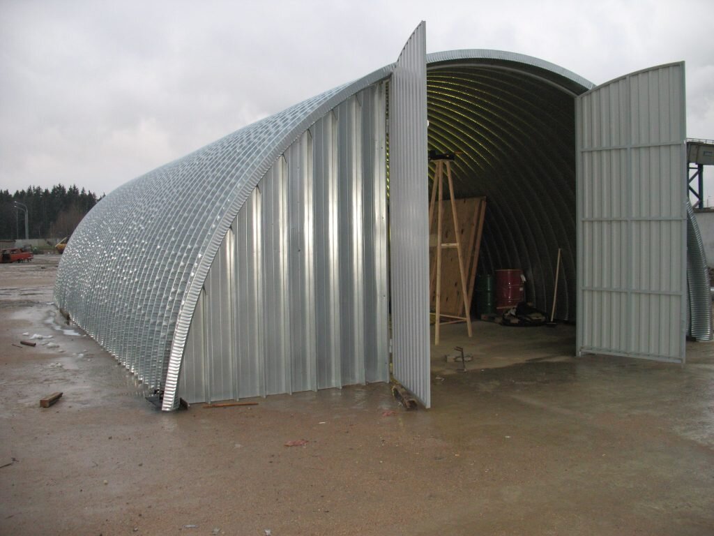 Ангар для вертолета построен на бетонной плите. Плита в данном случае выполняет функцию фундамента и пола. В торце здания установлены распашные металлические ворота. Ангар предназначен для хранения вертолета, используемого для организации вертолетных прогулок.
