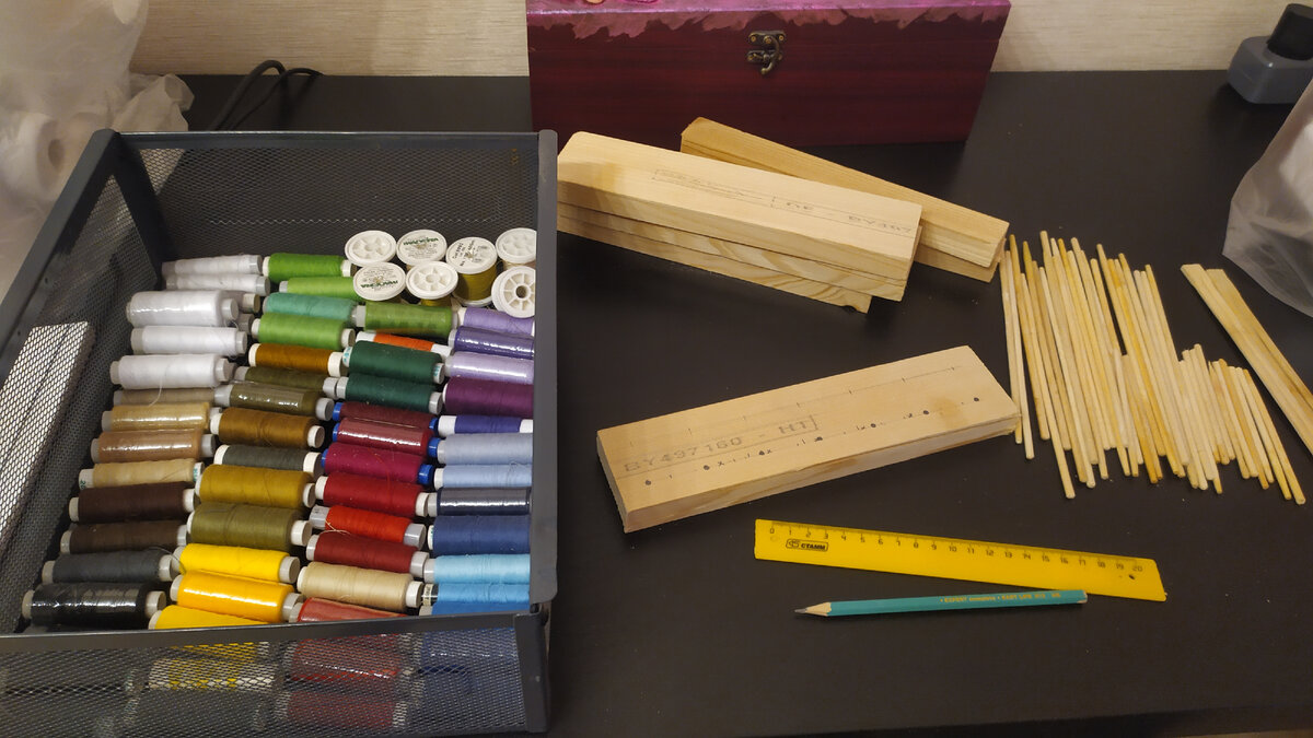 Когда ниток много, возникает необходимость их упорядочить. Чем я сегодня и занялась. Как видите, они у меня просто лежат в ящичке стеллажа ИКЕА. От ящичка я отказываться не буду, но нитки расположу более удобно. Для этого мне потребуется несколько брусочков и палочки из под суши. Палочки я отдельно не покупала - просто не выбрасывала много лет, авось пригодятся. Жалко такие славные выбрасывать было).