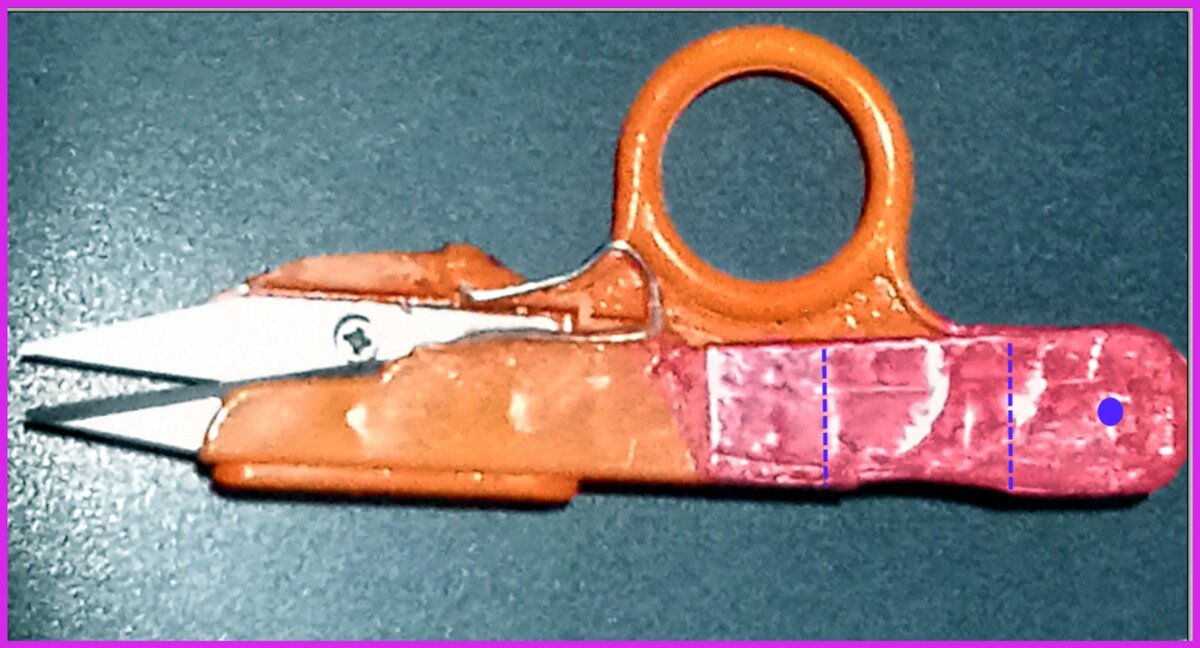 На этот раз купленный, когда-то в коллекцию этот экземпляр, приказал долго жить после нескольких пробных испытаний. В месте установки механизма возврата переломился корпус, который оказался пустотелым с тонкими стенками. Отложенный в дальний угол и он дождался своего часа. Самое сложное, что необходимо было сделать - восстановить механизм возврата, при этом о старом пришлось забыть. Решено было укрепить стенки, где он находился, путем заливки моментального клея, смешанного с содой. Для этого она снаружи была изолирована алюминиевой фольгой с клеевым слоем. Порывшись в запаснике, был найден элемент от зажима для бумаги, который и был установлен с боку подвижной части ручки. Для его установки были просверлены отверстия, в которые вставлены загнутые концы уже нового возвратного механизма, с последующей заливкой их жидким пластиком. В последующем планируется установка шпильки в оси стыковки обоих частей ножниц, Поскольку с переносом возвратного механизма в середину ножниц, изменился и це