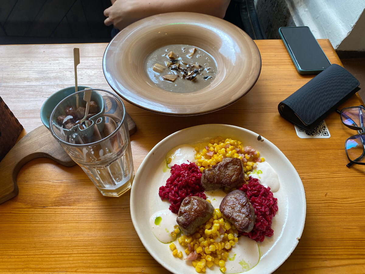 Не особо люблю шум, как и Мария, поэтому мы сели в соседний зал, где было потише. Еда вкуснейшая, вино напомнило мне нашу поездку в Армению, где у нас был целый винный тур. Всё понравилось, в том числе и кофе с тортиком, которые мы взяли в конце трапезы. Единственный минус, весьма не дёшево.