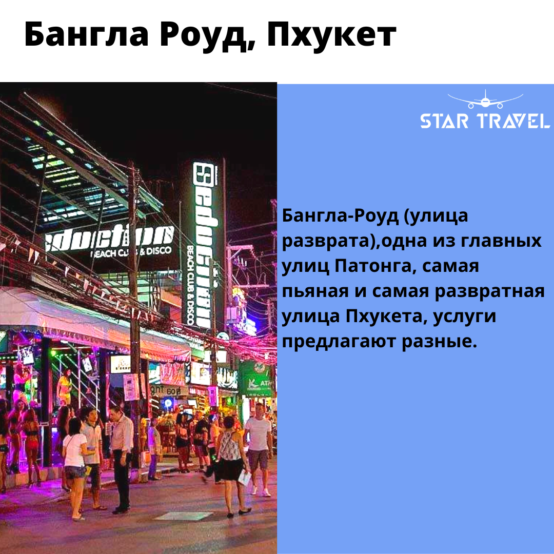 Бангла-Роуд (улица разврата),одна из главных улиц Патонга, самая пьяная и самая развратная улица Пхукета, услуги предлагают разные. Правая сторона улицы, отведена под разнообразные рестораны, спорт-бары, кафе и клубы. Здесь можно попробовать более или менее экзотическую кухню, в большом количестве включающую в себя свежие местные морепродукты, отдохнуть с семьёй или друзьями, или же посмотреть трансляцию матча на большом экране, с пивом, в компании таких же болельщиков. Левая сторона улицы, территория стриптиз-клубов и развлечений «для взрослых». Привлекательные девушки Таиланда стремятся завлечь гостей с улицы, а персонал баров старается угодить посетителей любыми способами. Здесь можно увидеть танцовщиц у шестов, установленных прямо на стойках, и посетить заведения с оригинальным оформлением и девушками, одетыми в фантазийные костюмы. Выступления без одежды в Тайланде запрещены, однако на улице Бангла Роуд это правило нередко игнорируют, как-то же надо привлекать мужчин, прилетевших