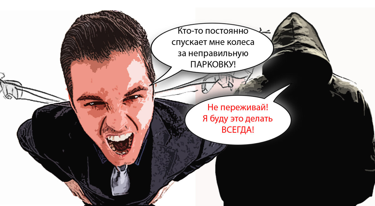 В конце-то концов пусть радуется, что жители двора предельно интеллигентны и никакого вреда машине не причиняют. Прием со спусканием колес практически безобиден, разве что тратит время водителя. Но ведь при правильной парковке проблем нет – он сам проверил.