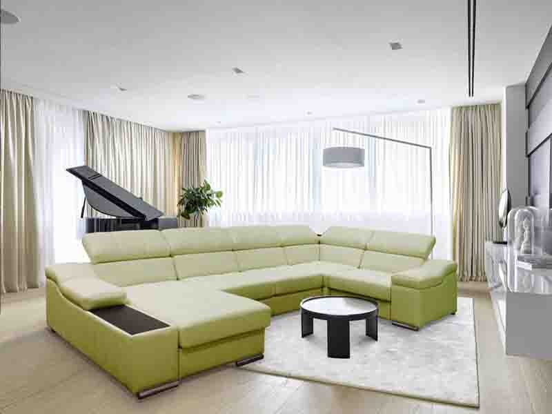 В большой гостиной можно легко установить достаточно массивный и громоздкий угловой диван в форме П. Здесь всё напрямую зависит от места установки и расположения мебели.