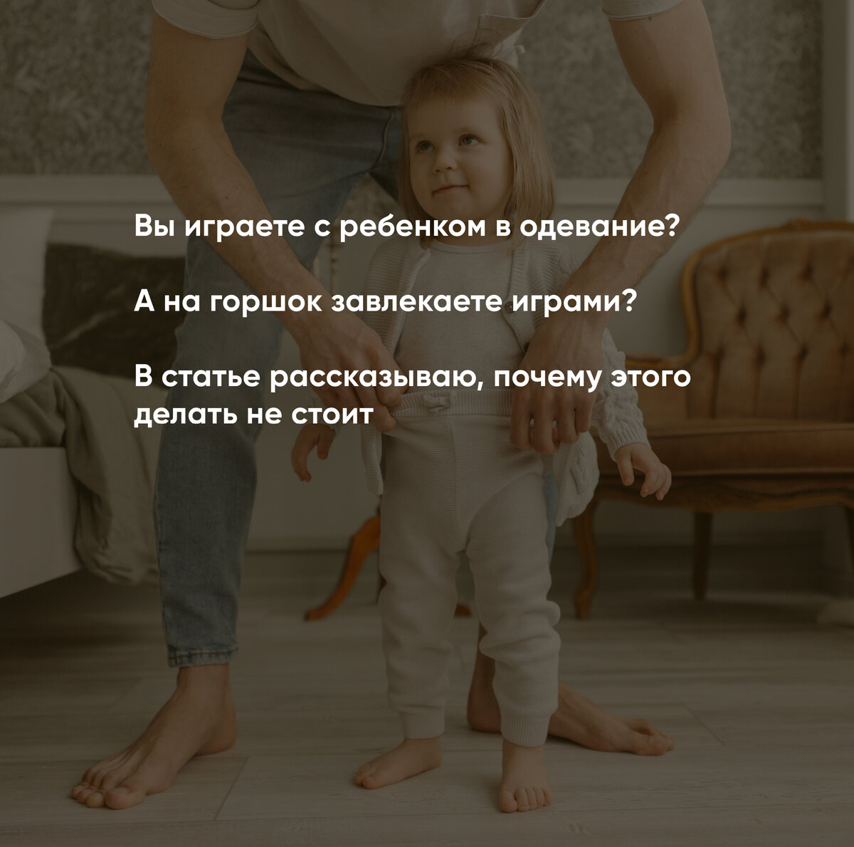Постоянно слышу советы, в том числе эксперты дают такие рекомендации в комментариях к моим статьям..) о том, что если ребёнок не хочет что-то делать, то нужно с ним поиграть. Конечно, можно и нужно играть с детьми. Но не стоит использовать игру как главное средство мотивации малыша что-либо сделать (одеться, сходить на горшок, почистить зубы и т.д.). Я наблюдала детей, которые привыкли, что с ними постоянно играют в одевание, и без активного участия взрослого дети не одевались, хотя прекрасно могли справиться сами. То же самое с чисткой зубов и другими бытовыми процессами. В итоге, взрослому приходится вовлекаться во многие процессы, которые ребенок может делать сам. От этого появляется усталость, а впоследствии и раздражение. Ведь у родителей не всегда есть время и ресурсы развлекать ребенка. В туалет тем более люди ходят не потому, что на унитазе красивая наклейка, а потому, что это естественная потребность. Дети гораздо умнее, чем часто кажется взрослым. Еще важный момент: все дети