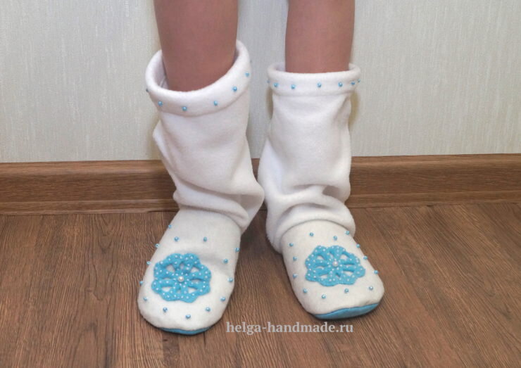 Старшая дочка на Новогоднем утреннике в садике играла роль Снегурочки. Я сшила ей сапожки для выступления. Дочке очень понравились. Такие сапожки, думаю, подойдут и для девочек, которые играют роль Снежинок. Для пошива таких сапожек нам понадобятся: плотный фетр белого и голубого цвета, флис белого цвета, иголка с нитками в цвет фетра, измерительная лента, ножницы и бисер для украшения. На фетре голубого цвета снимаем размер стопы (можно перенести со стельки), прибавив со всех сторон примерно по 0,7 см (можно по 1 см) и вырезаем 2 детали в зеркальном отражении. Из фетра белого цвета вырезаем деталь для верхней части (как на тапочки), примеряем и подгоняем по ноге ребёнка. С изнаночной стороны сшиваем стельку и верхнюю часть вместе. Выворачиваем на лицевую сторону. Затем из флиса вырезаем прямоугольник. Его высота зависит от нужной высоты будущих сапогов + 5(6) см на подгибку и швы. И пришиваем к полученному тапочку из фетра (где показано пунктирными линиями). Будет смотреться примерно