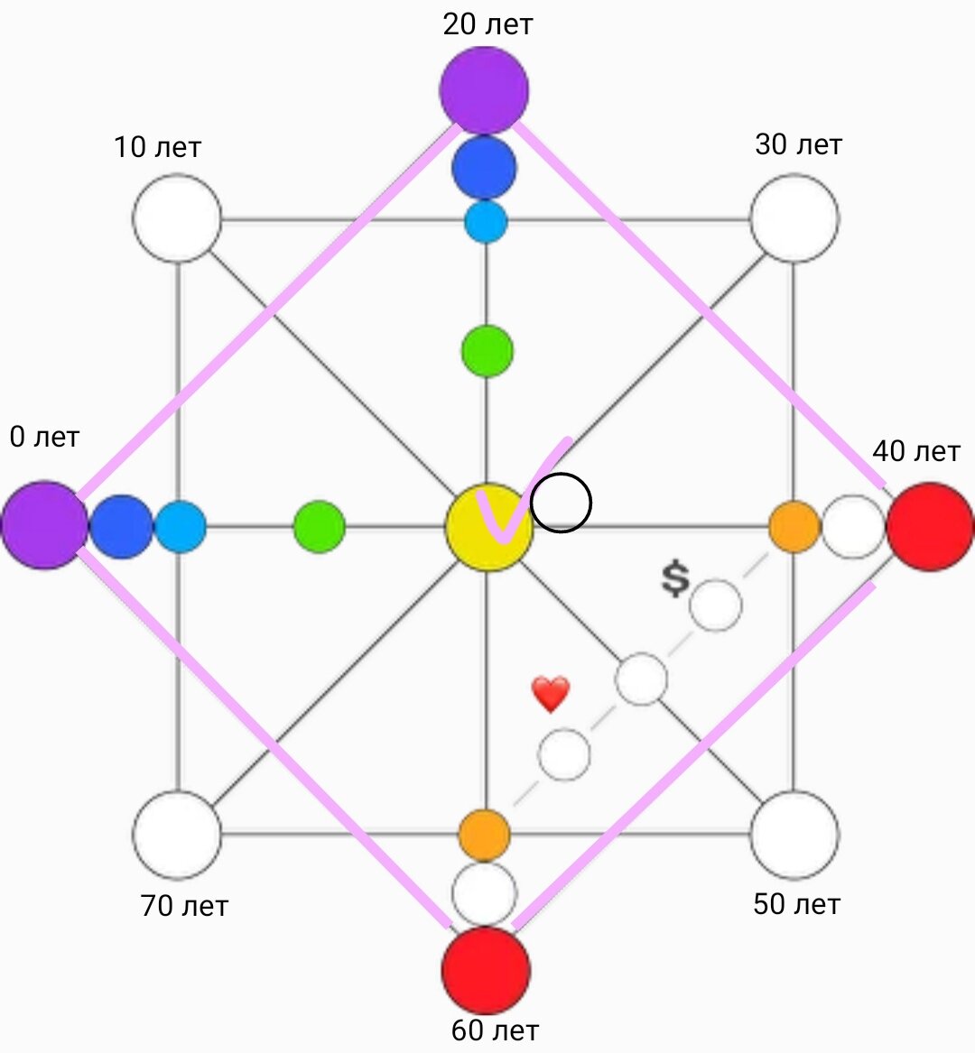 Как и обещала в статье ранее, подготовила для вас расчет Матрицы Судьбы по методу Натальи Ладини. Расчет будет выходить отдельными статьями, чтобы более полно раскрыть суть позиции и программ, образованных рядом стоящими арканами. Последовательно читая статьи, вы сможете легко рассчитать Матрицу судьбы, учитывая все тонкости, понимая трактовку всех позиций и программ. Для расчета нам необходима Дата рождения ДД.ММ.ГГ. Для примера разберём расчет Матрицы для человека, рождённого 26.01.1992. Заполнение позиций в Матрице будем осуществлять с помощью рисунка ниже, обозначая позиции не цифрами или буквами, а возрастом. 0 лет) Заполнение Матрицы начинается с крайней левой точки Личного квадрата по линии Земли в чакре Сахасрара(большая фиолетовая позиция) - это Портрет человека и его Ресурс, то каким его воспринимают люди в жизни, его ярчайшая характеристика, энергия, через которую человек легко восполняет свой ресурс. Вписываете дату вашего рождения. Числа от 23 до 31 складываем между со
