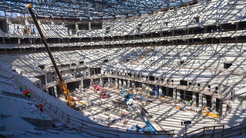 Внутри здания продолжается установка перегородок и отделка внутренних помещений. Фото: пресс-служба СКА Арены Общая готовность новой ледовой арены на проспекте Юрия Гагарина на сегодняшний день составляет 87,5%. Об этом сообщает газета «Петербургский Дневник» со ссылкой на компанию «СКА Арена». В настоящее время продолжается монтаж верхних блоков архитектурного фасада. Всего было смонтировано 4400 тонн металлоконструкций. Полностью завершено остекление здания. Алюминиевое покрытие купола кровли смонтировано на 60%. Внутри здания продолжается установка перегородок и отделка внутренних помещений. Рабочим предстоит покрасить 180 тыс. кв. м стен и 60 тыс. «квадратов» плитки. Современное оборудование и инженерные системы уже находятся на складах Петербурга. Ожидается, что «СКА Арена» станет самой вместительной в мире хоккейной площадкой: новый ледовый дворец будет вмещать 21,5 тыс. зрителей на хоккейных матчах и 23 тыс.— на концертно-развлекательных шоу. Стадион сможет принимать до 120 конц