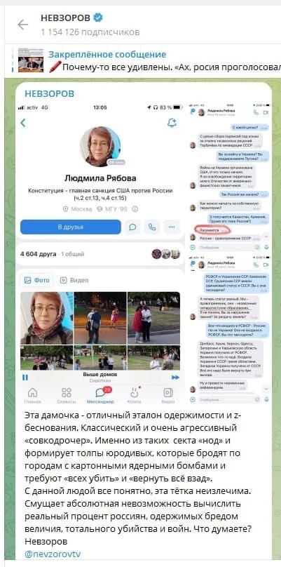 Невзоров: Опубликовал у себя ресурсов Людмилу Рябову которая является помощником депутата Федоров.Е.А и главного Координатор движения "НОД". И очень сильно критиковать начал движение "НОД"-назвав их "Сектой" которого призывает всех убить и т д ... Лично я думаю ,что действительно это движения "НОД " имеет склонность к сектанству и подобие кто не за них и они против них ! Играя роль ,что они от Путина и ходить с портретом как иконкой не является фактом !?.. Как вы считаете "НОД" это "СЕКТА?"