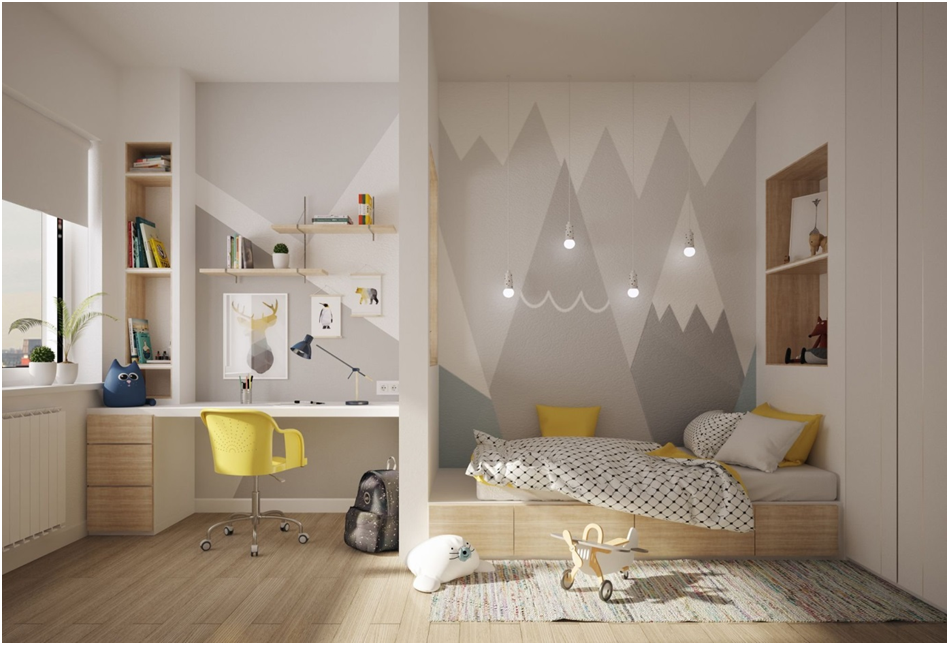 - Для каждого ребенка вне зависимости от площади комнаты оформляется его персональная зона и спальное место. Это обеспечит каждому жильцу комнаты полноценный отдых и уединение.