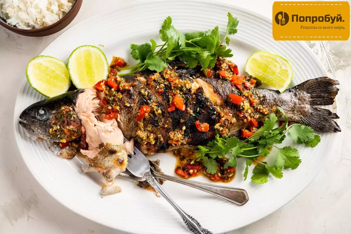 Подготовка: 15 минут Готовить: 18 минут Общий: 33 мин. Порции: 2 порции Этот традиционный тайский рецепт рыбы можно приготовить на открытом воздухе на барбекю или обжарить рыбу в помещении — в Таиланде ее готовят в обоих и дома и на улице. Вам понравится нежность рыбы в сочетании с фантастическим соусом из кориандра и чили, который можно сделать от мягкого до очень острого на ваш вкус. Хотя рецепт предназначен для форели, для этого рецепта можно использовать почти любую цельную рыбу с белым мясом. Если хотите, используйте морского окуня, морского леща или другую белую рыбу. Ингредиенты Для соуса: Соберите ингредиенты. Обсушите рыбу. Сделайте2-3 диагональных разреза на боку рыбы (лезвием ножа под углом к голове). Разрезы должны быть на расстоянии нескольких сантиметров друг от друга. Выдавите сок 1-2 лаймов на рыбу и внутрь. Посыпьте поверхность морской солью и отложите в сторону, пока вы готовите соус. Поместите воду, сок лайма + соевый соус, чеснок, сахар, имбирь, кориандр и пе