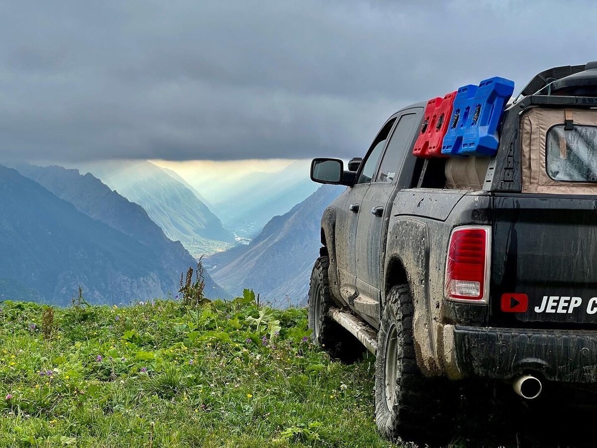 Первые три внедорожных днях путешествовали по Кабардино-Балкарии двумя экипажами - Jeep Wrangler Rubicon на 37-х под управлением пилота-подводника, капитана первого ранга - Андрея и я на Dodge Ram на 37-х колесах, который испытывает походный душ и выкатную платформу от @Jeep Custom