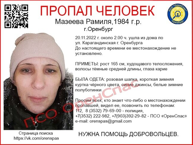 - Всех, кто знает что-либо о местонахождении пропавшей, видел ее, просят позвонить по телефонам: 112, 8-(3532)-79-69-00 - полиция, +7-(3532)-222-982, +7-(903)-392-29-82 - ПСО «ОренСпас»