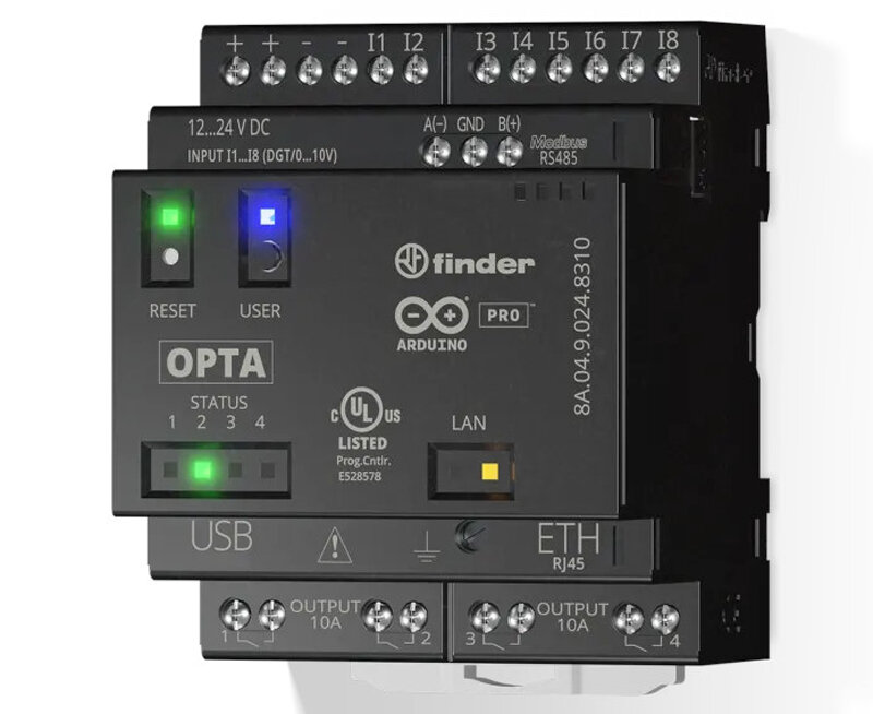 Команда Arduino в партнёрстве с Finder анонсировала программируемый логический контроллер (ПЛК) под названием Opta, предназначенный для промышленных устройств Интернета вещей (IoT). Решение может применяться, например, в оборудовании для систем управления и мониторинга в режиме реального времени. Размеры Arduino Opta составляют 90 × 85 × 69 мм; возможен монтаж на DIN-рейку. Применён микроконтроллер STMicroelectronics STM32H747XI с одним ядром Arm Cortex-M7 с частотой до 480 МГц и одним ядром Arm Cortex-M4 с частотой до 240 МГц. Объём памяти SRAM составляет 1 Мбайт, флеш-памяти — 2 Мбайт. Кроме того, есть 16 Мбайт флеш-памяти QSPI. В оснащение входят восемь цифровых/аналоговых входов (0–10 В), четыре контакта реле (до 10 А), порт USB 2.0 Type-C для питания/программирования, защитный модуль ATECC608B и порт RJ45 (LAN или MODBUS TCP/IP). Допускается подача DC-питания напряжением 12–24 В. Устройство весит 210 г и имеет класс защиты IP20. Для Arduino Opta предусмотрены три варианта исполнен