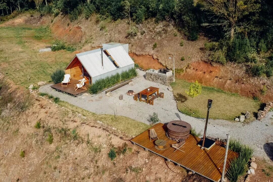 Этот коттедж, построенный в 2021 году во Флорес-де-Кунья, Бразилия, был спроектирован, как убежище для уединения на природе. Для тех, кто хочет сбежать от хаоса повседневной жизни. Отель включает в себя главный коттедж, пристройку и гостиную на открытом воздухе, окруженную местными фруктовыми деревьями, небольшим ручьем и дикой природой. Дизайн ориентирован на погружение посетителей в природу с помощью различных дизайнерских идей, включая использование огня в различных формах. Для обогрева коттеджа используется дровяная печь, место для костра на открытом воздухе создает пространство для сбора гостей. Для приготовления пищи на открытом воздухе используется гриль, а для отдыха в скромном патио установлена ванна на дровах. Жилая зона, площадью 90 м.2 покрыта двускатной крышей. В центре помещения находится кровать и мини-кухня, а в углу - дровяная печь. Окно в крыше пропускает свет в центр помещения. Для интеграции коттеджа с природой не были установлены жалюзи или шторы. На внешней терри