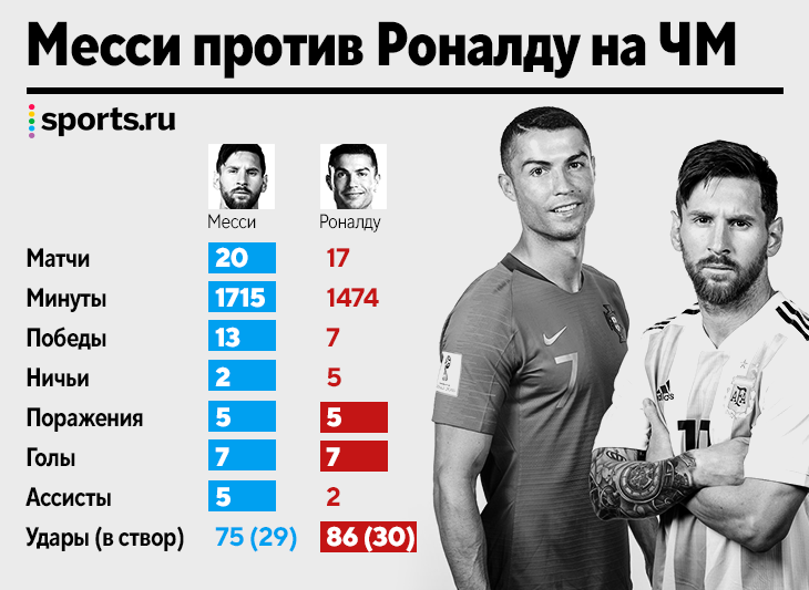 Повод сравнить. Аргентина сенсационно проиграла Саудовской Аравии – 1:2. Но единственный гол фаворита у Лионеля Месси: он реализовал пенальти на 10-й минуте. Так Лео сравнялся с Роналду по голам на чемпионатах мира – теперь у обоих по семь. Давайте сравним их выступления. • Почти по всем показателем Месси лучше: Роналду лишь нанес больше ударов (86 против 75, хотя так ниже эффективность) и меньше минут тратит на гол (210 против 245). • Из действующих игроков на ЧМ больше забил только Томас Мюллер – 10 голов в 16 матчах. На уровне с Месси и Криштиану идет Луис Суарес: семь голов в 13 играх. До Месси только Пеле, Зеелер, Клозе и Роналду забивали на четырех ЧМ Для Месси и Аргентины это грустный день и разочаровывающий старт турнира, но вместе с этим все же и новый шажок в историю. • Лео играет уже на пятом чемпионате мира – он повторил достижение вратаря сборной Мексики Антонио Карбахаля, немецкого защитника Лотара Маттеуса, защитника Мексики Рафаэля Маркеса и итальянского вратаря Джанлуи