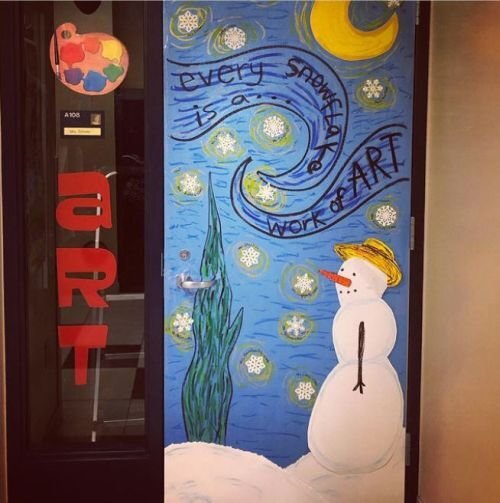 Одна нетривиальная идея — и простая дверь превращается в снежную звездную ночь! Идеально подойдет для кабинетов изо и порадует любителей творчества великого голландца (учителя рисования в первую очередь).