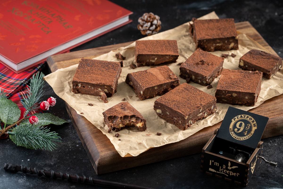 Домашние шоколадные ириски по книге о Гарри Поттере 📖 Ингредиенты: - Темный шоколад - 400 г. - Сгущёнка- 400 мл. - Соль - щепотка - Грецкие орехи очищенные - 100 г. 🧑🏻🍳 Приготовление: 1. В глубокой миске соединить порубленный шоколад, сгущенное молоко и соль. 2. Отправить в микроволновку на 2 минуты и растопить шоколад. Перемешать все до однородной консистенции. 3. Добавить измельченные грецкие орехи и перемешать. 4. Форму диаметром 20 см застелить пергаментной бумагой. Влить смесь в форму 5. Отправить в холодильник на 2 часа. 6. Застывший шоколадный пласт вытащить из формы, разрезать на квадратики, посыпать какао порошком и подавать к столу.