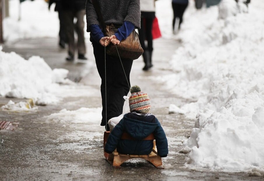 Купив в магазине молока, сыра и хлеба, женщина с ребёнком поспешили домой.