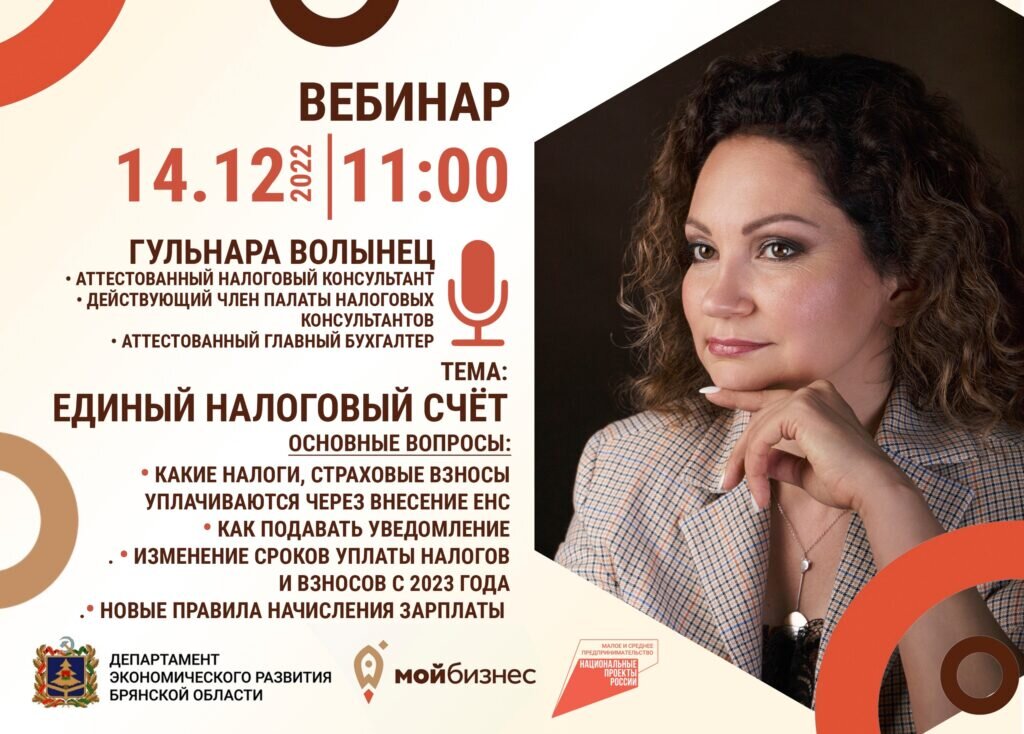 Центр «Мой бизнес» пригласил брянских предпринимателей на бесплатный вебинар «Единый налоговый платёж». Он состоится 14 декабря в 11:00. — С 2023 года кардинально меняется порядок уплаты налогов — все организации и предприниматели перейдут на единый налоговый платёж. Это уже не эксперимент для желающих, как в 2022 году, а обязательный порядок, — пояснила спикер мероприятия Гульнара Волынец. Запись вебинара отправят только зарегистрированным участникам. Зарегистрироваться можно по ссылке. Более подробную информацию можно получить по телефонам: 8-920-840-91-09, 8-4832-58-92-77. 16+ Брянских бизнесменов пригласили на бесплатный «налоговый» вебинар