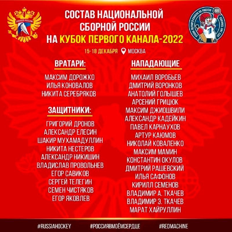 Наставник сборной России Алексей Жамнов назвал состав команды на Кубок Первого канала. На турнире россияне сыграют со сборными Казахстана и Беларуси. Вратари Максим Дорожко ("Витязь") Илья Коновалов ("Динамо" М) Никита Серебряков ("Адмирал") Защитники Георгий Дронов ("Металлург" Мг) Александр Елесин ("Локомотив") Шакир Мухамадуллин ("Салават Юлаев") Никита Нестеров (ЦСКА) Александр Никишин (СКА) Владислав Провольнев (ЦСКА) Егор Савиков ("Спартак") Сергей Телегин ("Трактор") Семен Чистяков ("Авангард") Егор Яковлев ("Металлург" Мг) Нападающие Михаил Воробьев (СКА) Дмитрий Воронков ("Ак Барс") Анатолий Голышев ("Автомобилист") Арсений Грицюк ("Авангард") Максим Джиошвили ("Динамо" М) Александр Кадейкин ("Салават Юлаев") Павел Карнаухов (ЦСКА) Артур Каюмов ("Локомотив") Николай Коваленко ("Торпедо") Максим Мамин (ЦСКА) Константин Окулов (ЦСКА) Дмитрий Рашевский ("Динамо" М) Илья Сафонов ("Ак Барс") Кирилл Семенов ("Ак Барс") Владимир А. Ткачев ("Трактор") Владимир Э. Ткачев ("Авангард") М